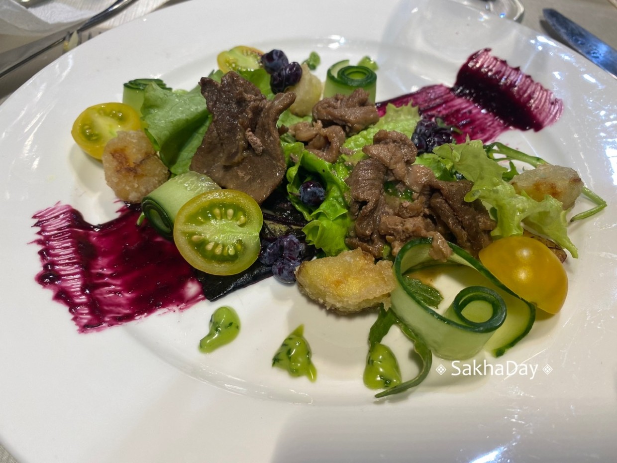 Самый молодой шеф ресторана "Муус Хайа" Игорь Глухарев приготовил салат "Жеребятина томленая с осенними овощами". Визуально салат превосходен, но воспринимается как закуска – набор разных ингридиентов. Может потому что голубичный соус был больше украшением, намазанным по тарелке. Сервировка у всех была разная, у кого-то по центру было много ягод, у кого-то, как у меня на фото, разбросаны по тарелке.