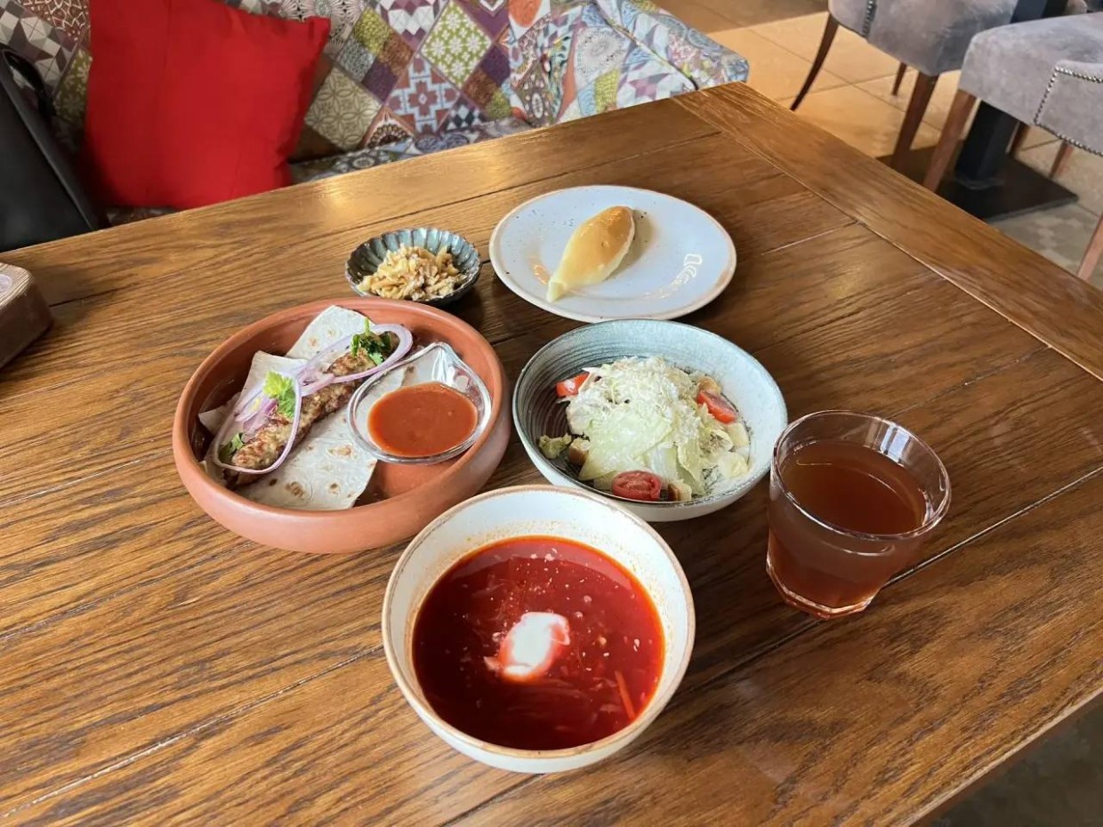 Ланч №1. Борщ со сметанкой, сочный люля-кебаб с курицей, салат Цезарь с курицей, грузинский хлеб Шоти. На десерт — сладкий чак-чак — большая редкость в заведениях города! На выбор напитки: морс, компот, вода.