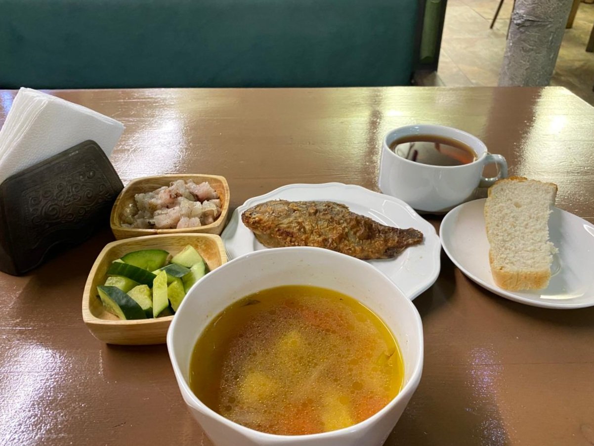 Итак, к вашему вниманию — уха по-домашнему, карась жареный, салат Индигирка, огурцы свежие, кусочек авторского хлеба и чай с сахаром. Как видите, мы выбрали полностью рыбный ланч. А вы, например, можете заказать — суп из потрохов, тефтели из оленины с картофелем, саламаат, хлеб и чай.
