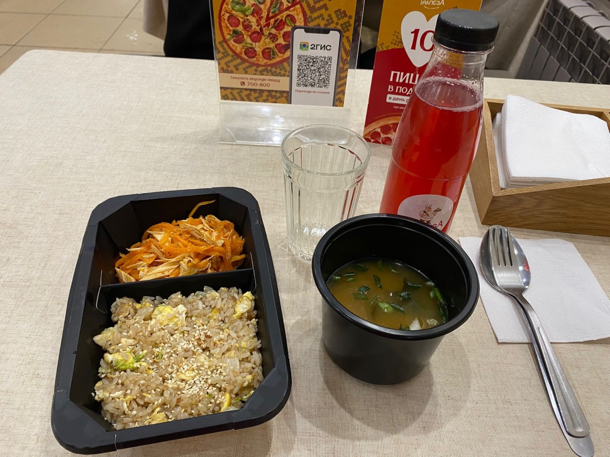 Легкий суп мисо, сытный жареный рис с яйцом, салат со спаржей и фирменный морс в бутылочке. Кроме того, в кафе можно отведать популярные блюда других азиатских и восточных стран.