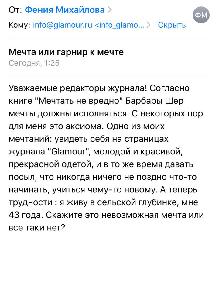 Все началось с письма. Нам в редакцию на общую почту пришло письмо от нашей читательницы Фении Михайловой с темой «Мечта или гарнир к мечте»: «Уважаемые редакторы журнала! Согласно книге "Мечтать не вредно" Барбары Шер мечты должны исполняться. С некоторых пор для меня это аксиома. Одно из моих мечтаний: увидеть себя на страницах журнала "Glamour", молодой и красивой, прекрасно одетой, и в то же время давать посыл, что никогда ничего не поздно что-то начинать, учиться чему-то новому. А теперь трудности : я живу в сельской глубинке, мне 43 года.Скажите это невозможная мечта или все таки нет?» (пунктуация и орфография автора сохранена – прим. ред.).