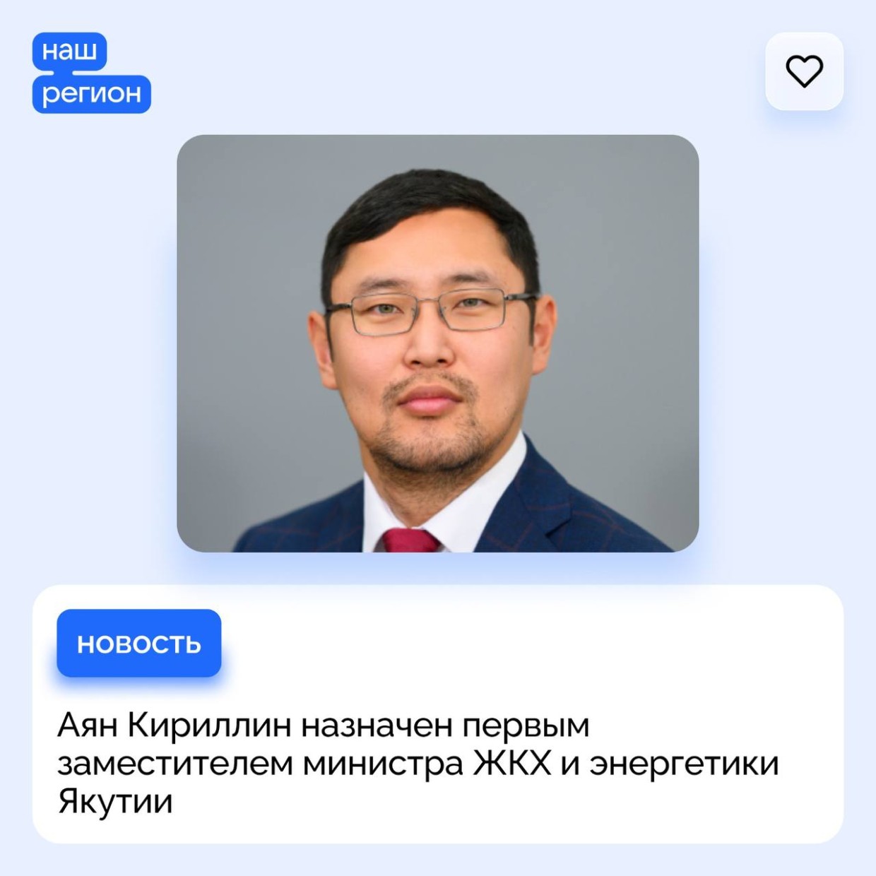 Аян Вячеславович Кириллин назначен первым заместителем министра жилищно-коммунального хозяйства и энергетики Республики Саха (Якутия).