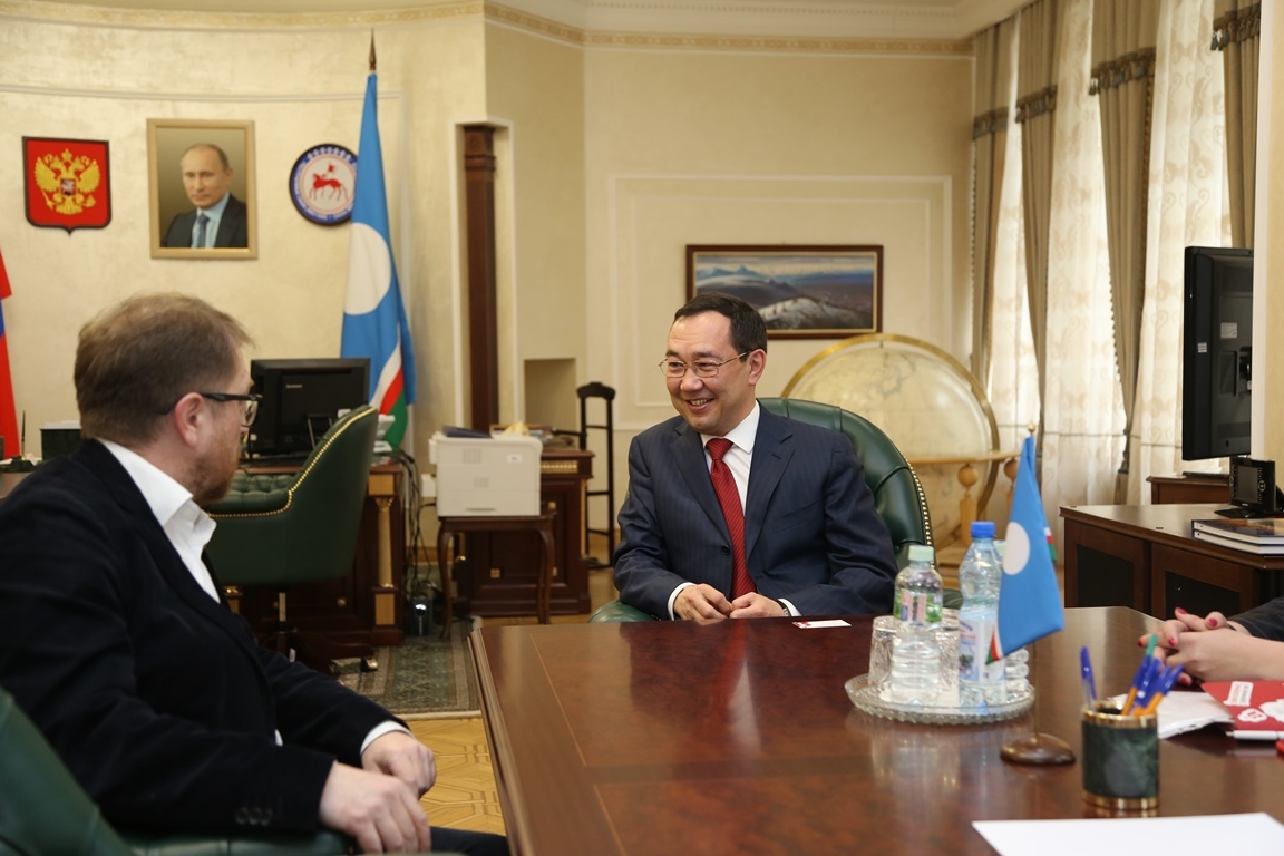 В постпредстве Республики Саха (Якутия) состоялась встреча Главы республики Айсена Николаева с Ольгой Ребковец, членом Совета по русскому языку при Президенте России, учредителем фонда «Тотальный диктант» и писателем Андреем Геласимовым, автором текста диктанта-2020.