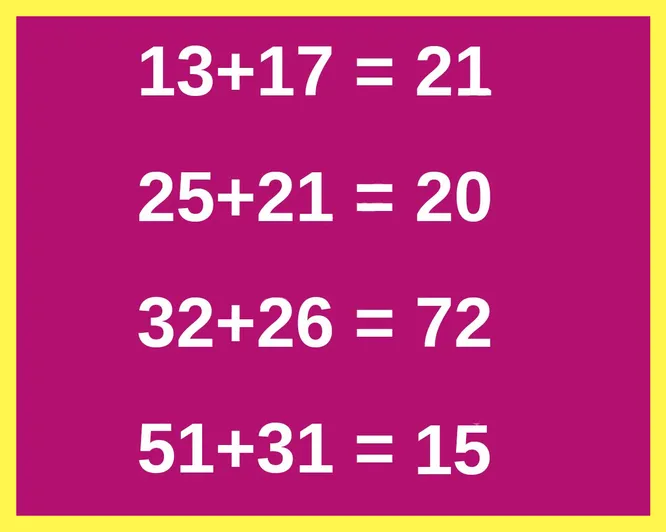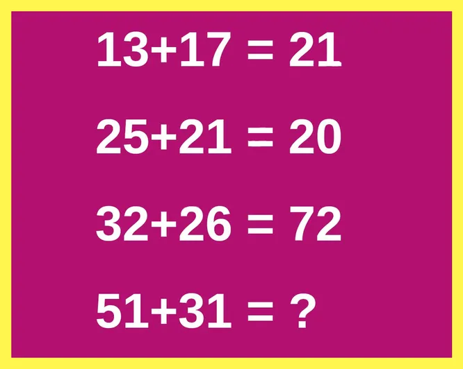 Нужно разбить числа, которые расположены слева от знака равенства, на два числа, затем перемножить и сложить результаты. Выглядит это таким образом: 51+31=(5*1)*(3*1)=5*3=15.