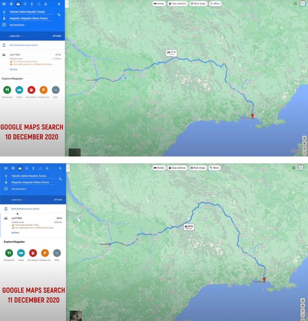 Google Maps изменил рекомендуемый маршрут от Якутска до Магадана после публикации истории о мужчине, замерзшем насмерть при температуре -50°C после выполнения инструкций от Google Maps. Предложенный ранее маршрут был заброшен в течение многих лет, сообщает @siberian_times.