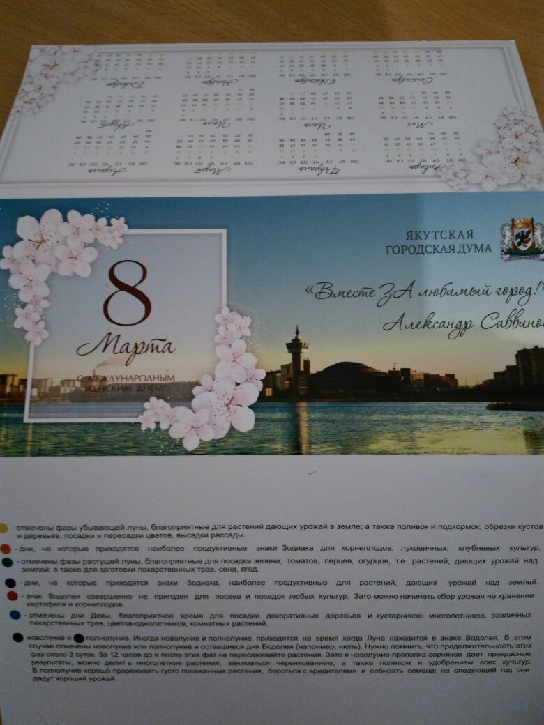 Жизнь Гордума Якутска подарила горожанкам лунный календарь 19:52 - 7.3.2018 Сегодня в некоторых домах Якутска вручали подарки от Гордумы с открыткой-календарем и тюльпаном, сообщили Sakhaday читатели. #якутск #гордума #8 марта #поздравления