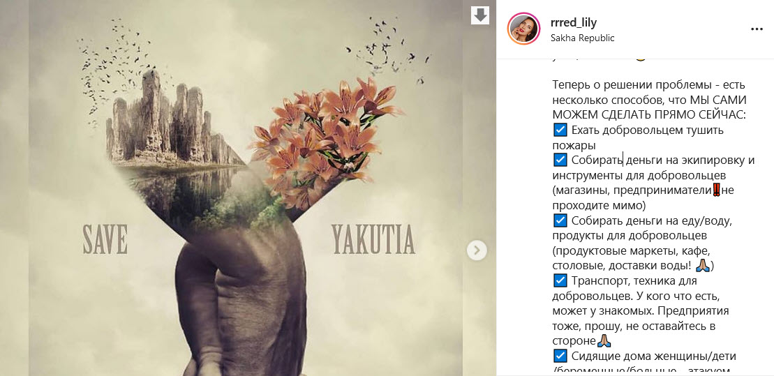Девушка написала несколько способов помощи: ехать добровольцем тушить пожары, собирать деньги на экипировку и инструменты для добровольцев, на еду/воду, продукты для добровольцев, помочь с транспортом добровольцам, атаковать соцсети, молиться и призывать дождь: