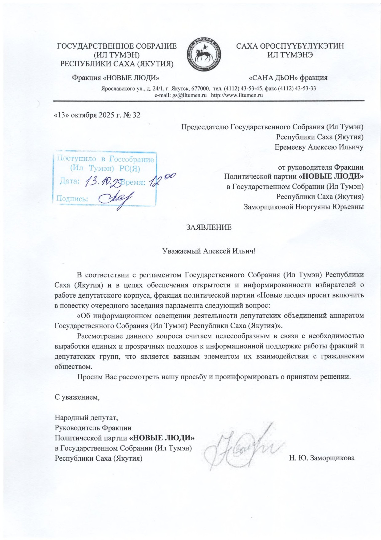 Руководитель фракции «Новые люди» в Государственном Собрании (Ил Тумэн) Республики Саха (Якутия) Нюргуяна Заморщикова обратилась к председателю парламента Алексею Еремееву с официальным заявлением, в котором говорится о нарушении принципа равенства депутатов и ограничении доступа граждан к информации.