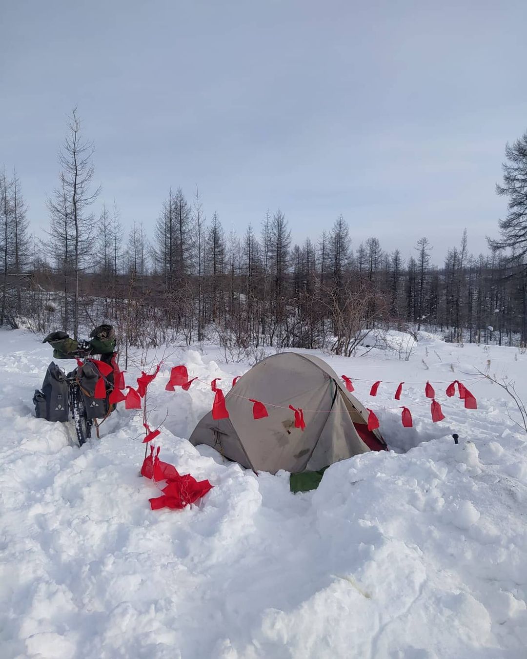 Итальянский велосипедист, путешествующий по Якутии, отпугивает волков красными флажками