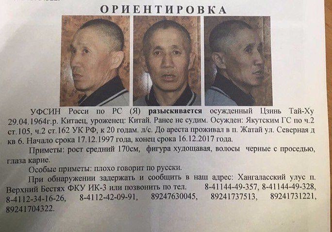 В УФСИН журналисту SakhaDay сообщили, что побег совершил один заключенный, уроженец Китая. Судя по ориентировке, китаец сбежал, не дождавшись 4 месяцев до освобождения.