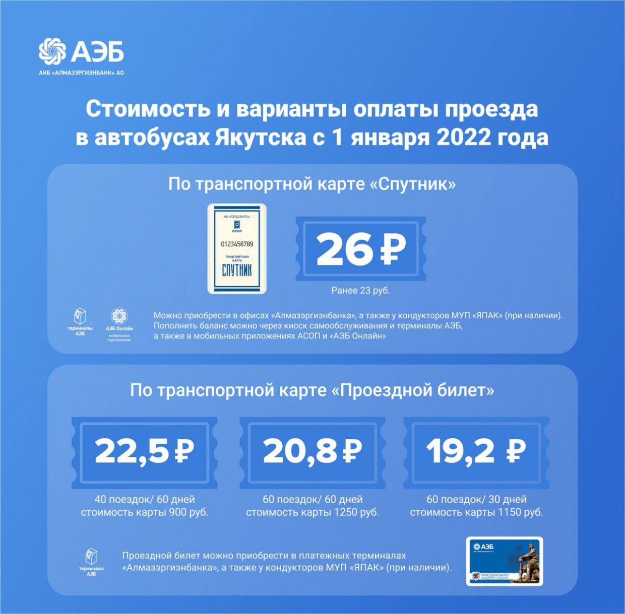 По картам «Спутник», которая заменила обычную транспортную карту старого образца, поездка стоит 26 рублей. Транспортную карту «Спутник» можно приобрести в офисах Алмазэргиэнбанка, киосках «Горпечать», а также у кондукторов МУП «ЯПАК» - при наличии.
