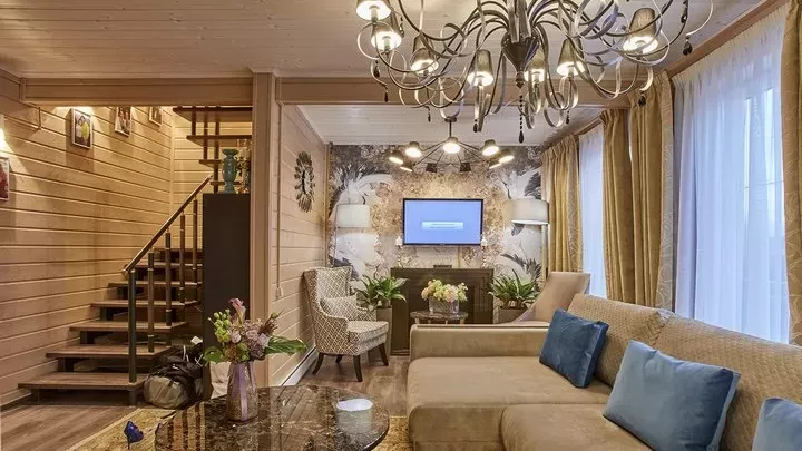 На первом этаже расположена гостиная, зона отдыха, кухня, кабинет, а также ванная комната. Весь интерьер выполнен в бежевых оттенках с небольшими золотыми и синими акцентами. Мебель во всём доме добротная, выполненная из дорогих пород дерева.