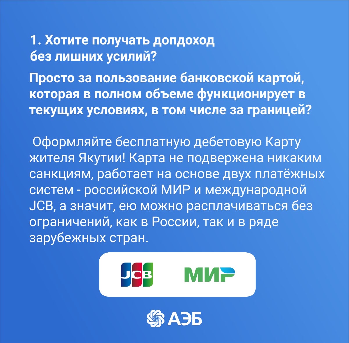 Предлагаем ознакомиться с возможностями этой многофункциональной платёжной карты на основе национальной платёжной системы МИР с расширенным нефинансовым функционалом в карточках АЭБ.