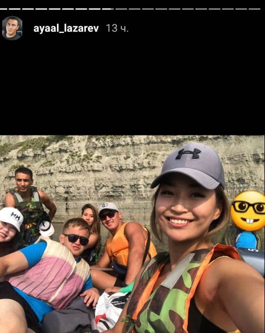 Борец-тяжеловес Айаал Лазарев выложил сториз со сплава по реке, где на одном фото заклеил эмодзи лицо некой девушки.