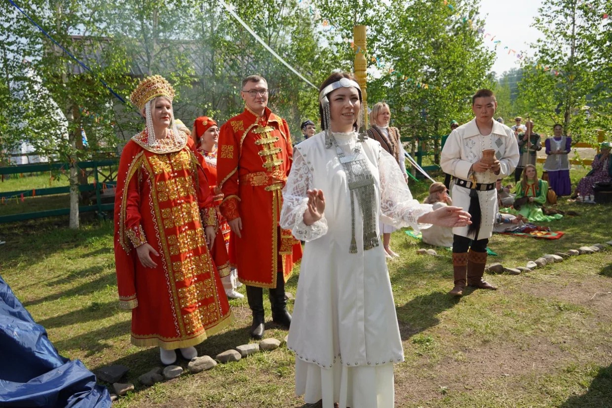Пары в русских и якутских национальных костюмах встречали гостей на входе и провожали на поляну, где был воссоздан быт якутского народа.