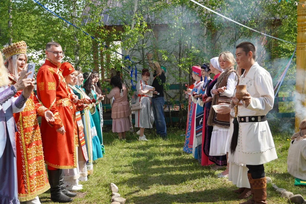 Пары в русских и якутских национальных костюмах встречали гостей на входе и провожали на поляну, где был воссоздан быт якутского народа.