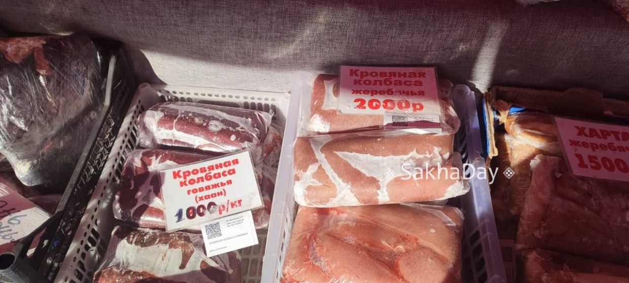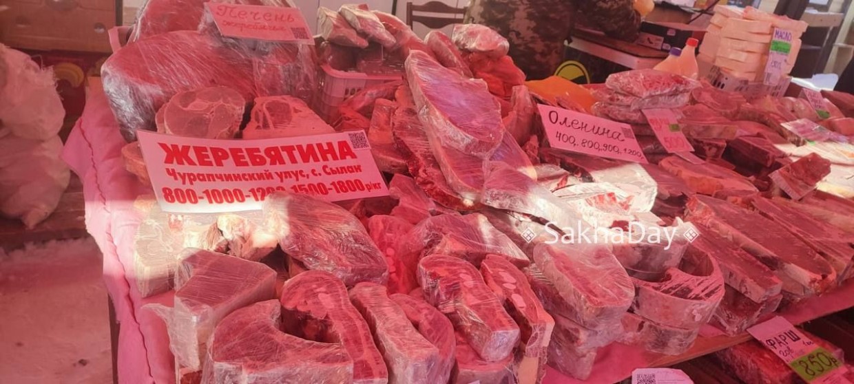 Тепло укутанные торговцы рекламируют свой товар - берите говядину, ребра по 700 рублей, мякоть от 850 рублей. Жеребятина в среднем от 1000 до 1800 рублей за килограмм, оленина 800 рублей, свинина 500-600 рублей.