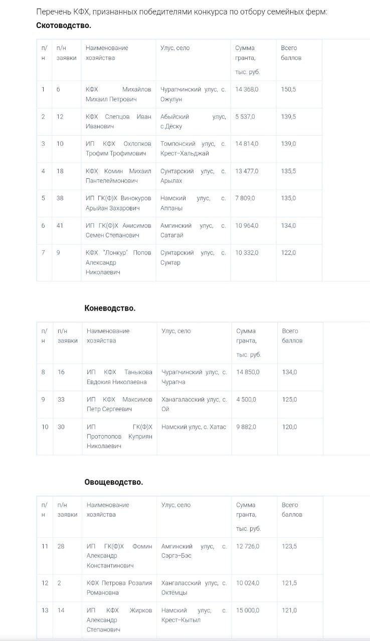 «По итогам конкурса получателями субсидий на развитие семейной фермы стали 13 глав крестьянских фермерских хозяйств из 7 районов республики, которые занимаются овощеводством и разведением крупного рогатого скота и лошадей. Деньги направят на строительство и реконструкцию коровников и конебаз, приобретение сельскохозяйственных животных, а также на закуп спецтехники и оборудования» - сообщил министр сельского хозяйства республики Александр Атласов.
