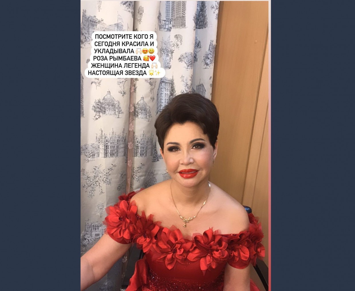 Певица Сахая рассказала в своем аккаунте о встрече с примой: "Я спела, и выйдя в закулисье, толком не поняла, что очаровательная девушка в красном это Роза Рымбаева. В свои 64 года она выглядит молодо и очаровательно. Она мне еще сделала комплимент, сказала, что я прекрасно спела".