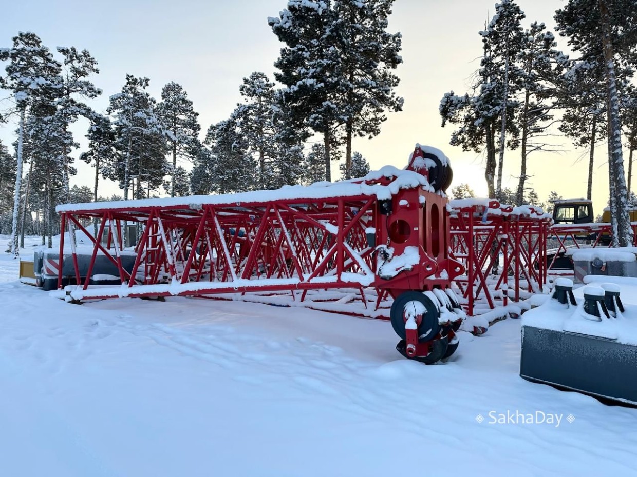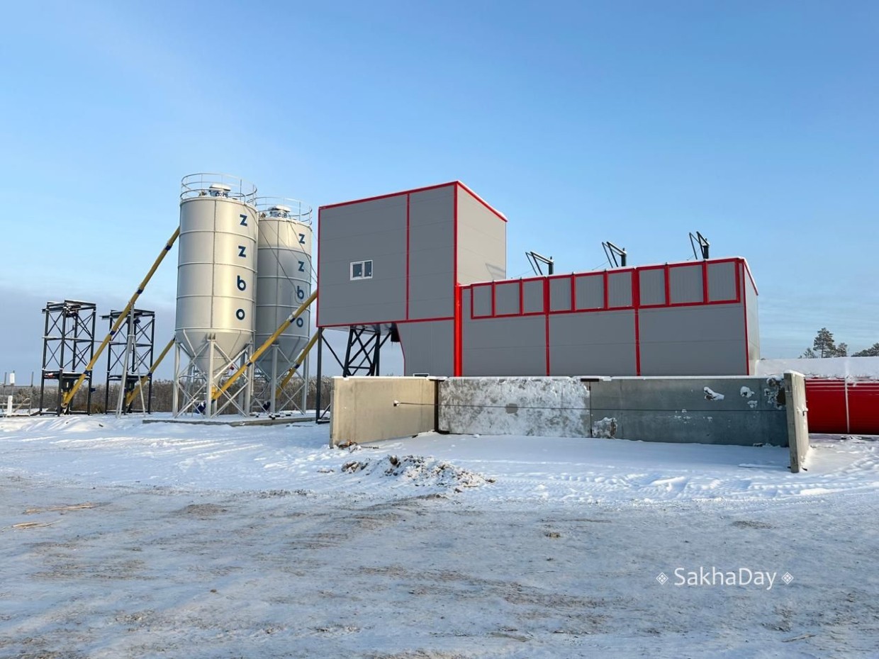 На третьей технологической площадке, недалеко от села Хаптагай, увидел небольшой временный посёлок и бетонный завод. Завод пока не действует, ведется отсыпка площадки. Навивочный станок, который должен производить арматурные каркасы для свай, стоит без крыши. Рядом под снегом лежат кучи той самой арматуры.