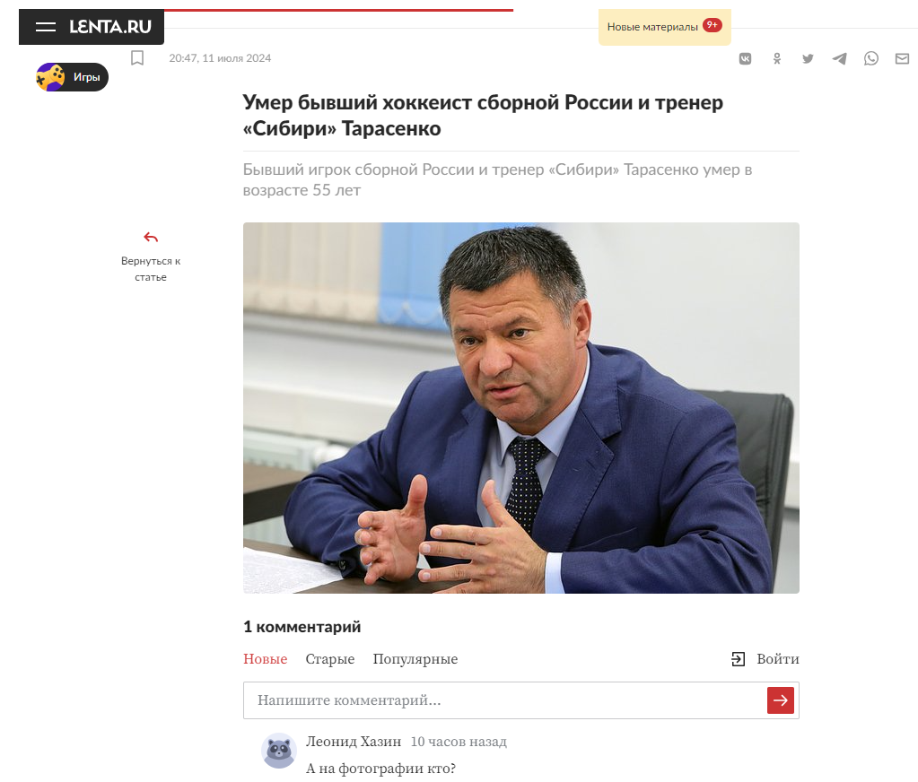 Издание «Лента.ру» вчера вечером сообщило о смерти бывшего хоккеиста сборной России и тренера «Сибири» Андрея Тарасенко. К новости медиа опубликовало фото экс-председателя правительства Якутии Андрея Тарасенко. Под публикацией единственный комментарий: а на фотографии кто?