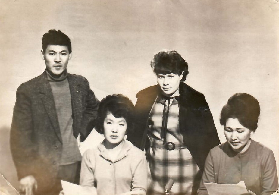 Виктория (сидит слева) с сотрудниками Якутского телевидения. Справа сидит диктор известная Лира Белолюбская. Слева фотокорреспондет Якутского Гостелерадио Анатолий Мыреев. Несколько лет он проработал также фотокором в редакции газеты «Социалистическая Якутия». 1966-67 гг.
