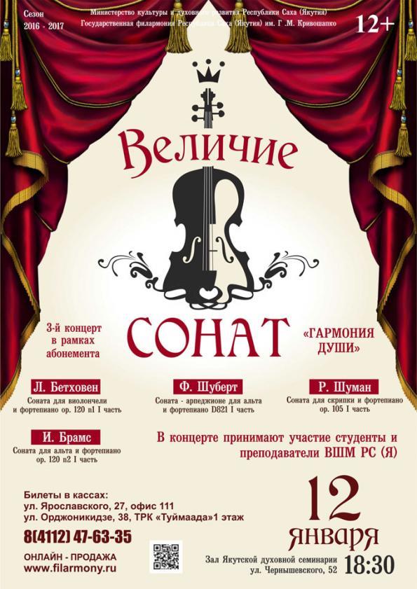 12 января в 18:30 состоится 3-й концерт в рамках абонемента «Гармония души» под названием «Величие сонат». Участие в концерте примут студенты и преподаватели Высшей школы музыки РС(Я) им. В.А. Босикова.