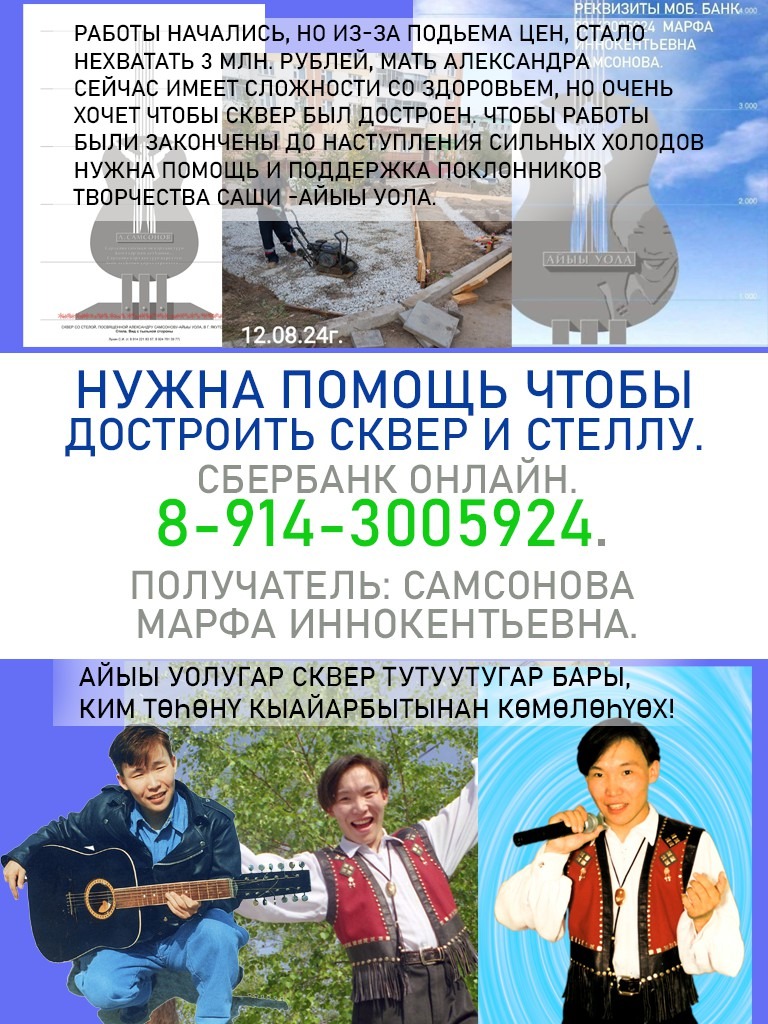 В начале августа в Якутске началось строительство сквера имени легендарного якутского исполнителя Александра Самсонова – Айыы уола. 75-летняя Марфа Самсонова хочет увековечить имя своего сына, построив сквер, где молодежь будет собираться в круг: петь песни и играть на гитаре. Но чтобы довести дело до конца, Марфе Иннокентьевне нужна помощь, передает SakhaDay.