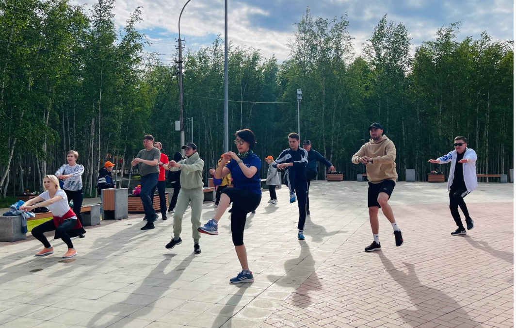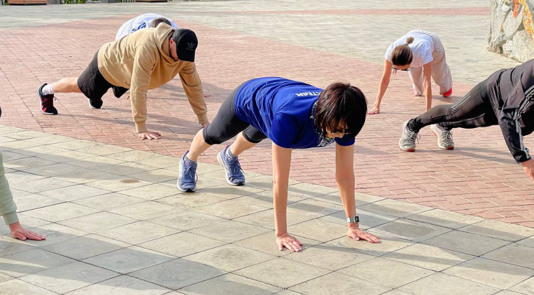 Чиновники и представители разных компаний стояли в несложной планке, сделали отжимания и пробежались по городскому парку.
