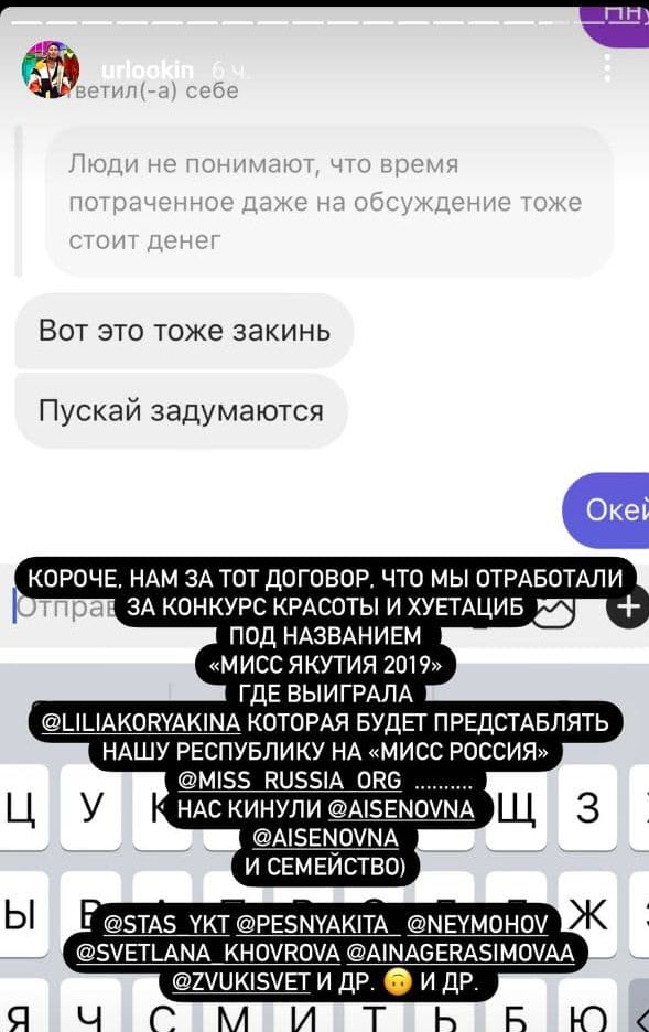 "Люди, которые были организаторами по проекту "Мисс Республика Саха (Якутия) 2019", попрошу вашей поддержки. Нам не заплатили за тот договор, что мы отработали за конкурс красоты. Мне должны сто с лишним тысяч рублей", - написал он, и отметил всех, кто был причастен к конкурсу. Позже модельер удалил свои сторис.