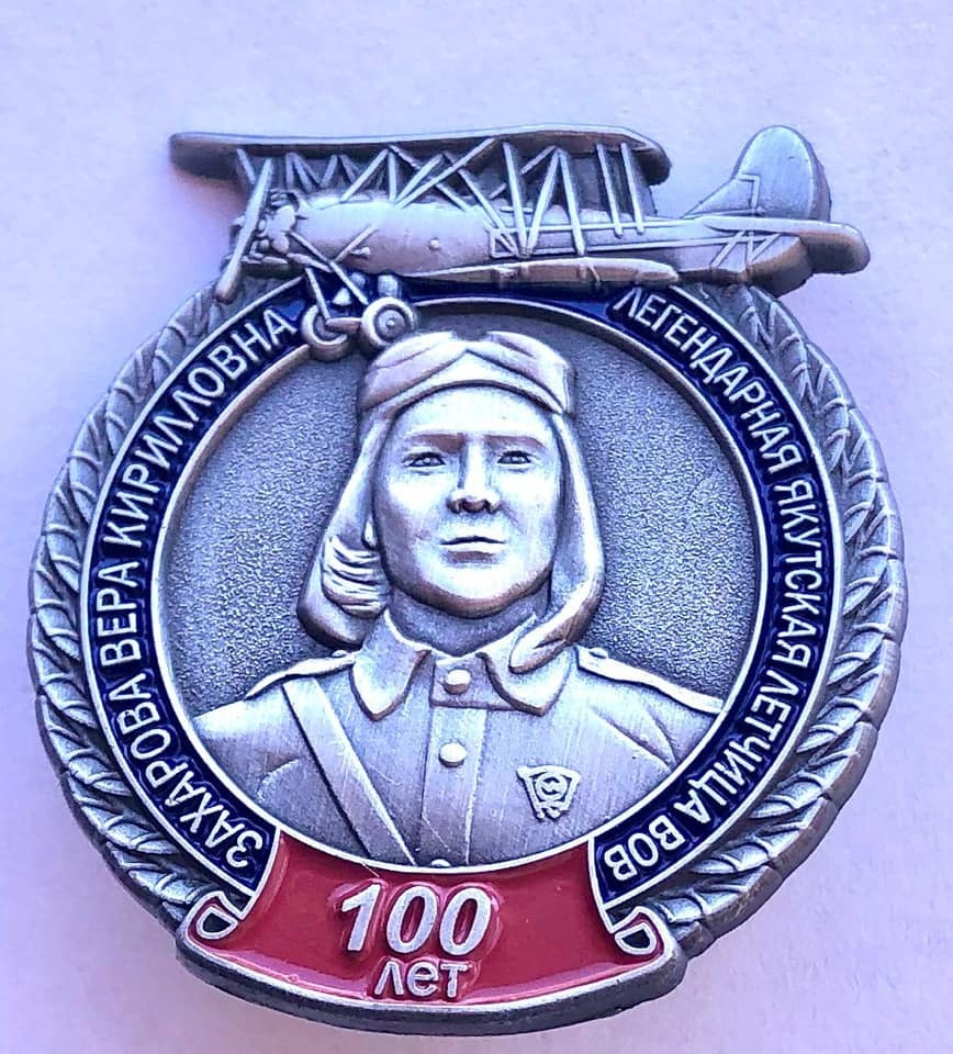 Почетный Знак выполнен из серебристого металла с изображением самолета, на котором она совершала полеты и дает представление о бюсте, который будет находиться в родном для Веры Захаровой селе Дельгей.
