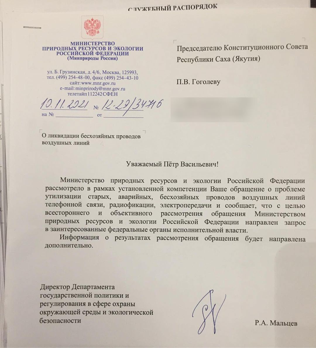 В связи с этим Петр Гоголев обратился в адрес министра природных ресурсов и экологии России Александру Козлова о необходимости решения проблемы утилизации бесхозяйных проводных линий как опасных объектов накопленного вреда окружающей среде, в том числе с включением необходимых мероприятий в национальный проект «Экология». Он опубликовал ответ.