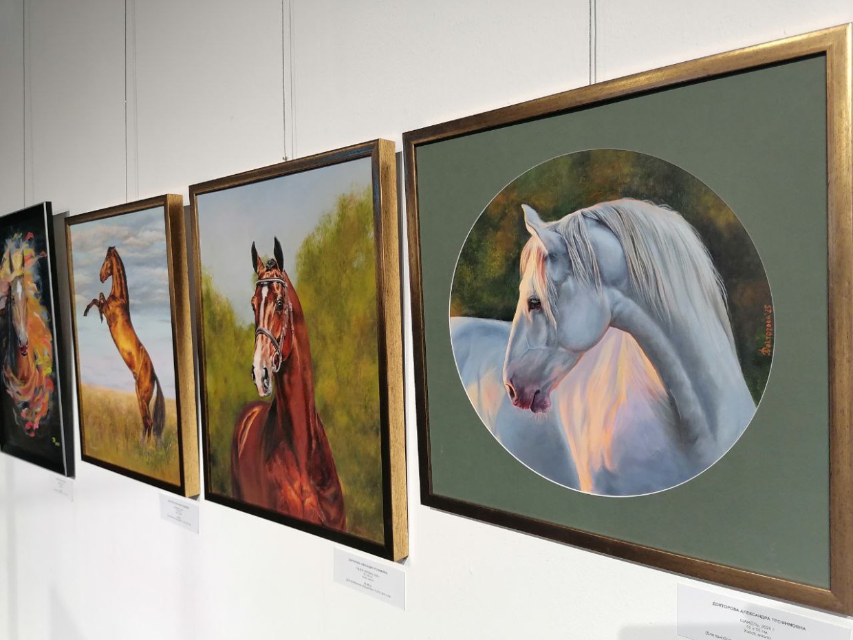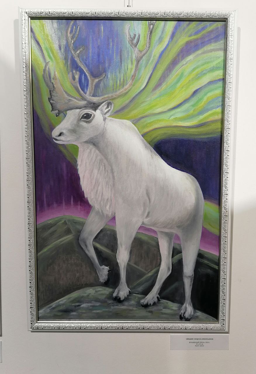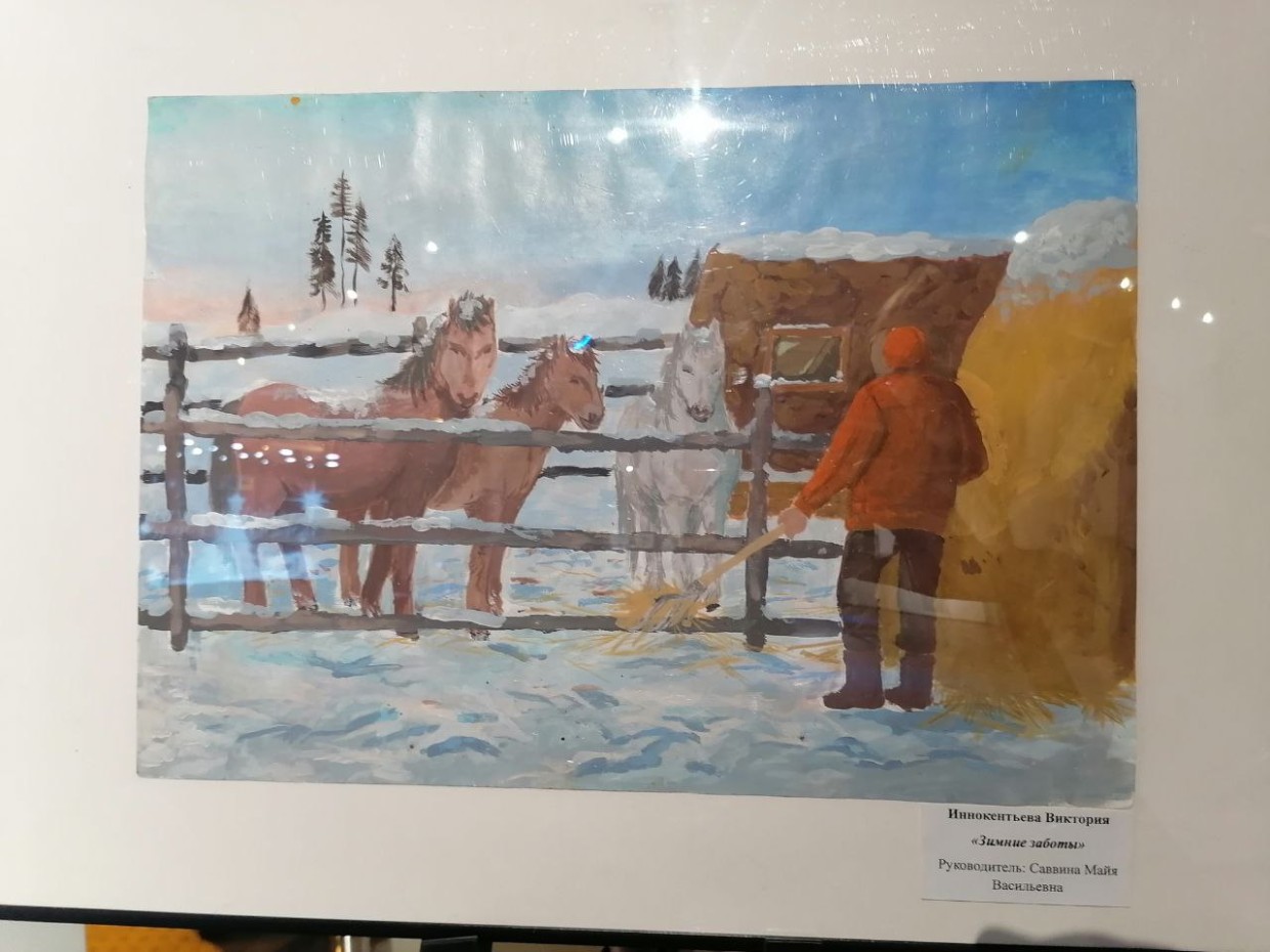 Живописные картины Лены Лазаревой, Светланы Ивановой, Ларисы Добровой и других запечатлели волшебные зимние пейзажи; чудесные открытки Сарданы Чичирбыновой — танец снежинок в свете фонаря; линогравюра Сахайи Еремеевой — уютный зимний вечер якутской семьи со строганиной; художница-керамист Лена Пинигина в этот раз представила интерьерного Чысхаана, выполненного в сложной технике; Александра Докторова — своё любование великолепными грациозными лошадьми.