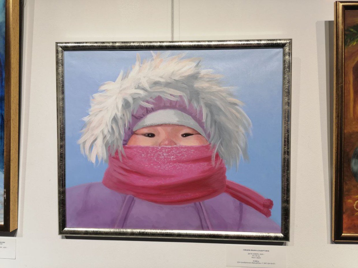 Выставка объединила не только якутских авторов разного возраста, но и художников из Москвы, Домодедово, Ростова-на-Дону, Ростовской области и Тюмени. Так что свои картины на выставку авторы не только приносили, но и присылали ... в виде фотографий вполне смотрибельных размеров. Такую работу, оказывается, можно приобрести, при этом на ярлыке под фотографией указываются не только название картины, ее размер и авторство, но и телефон, по которому можно связаться с художником.