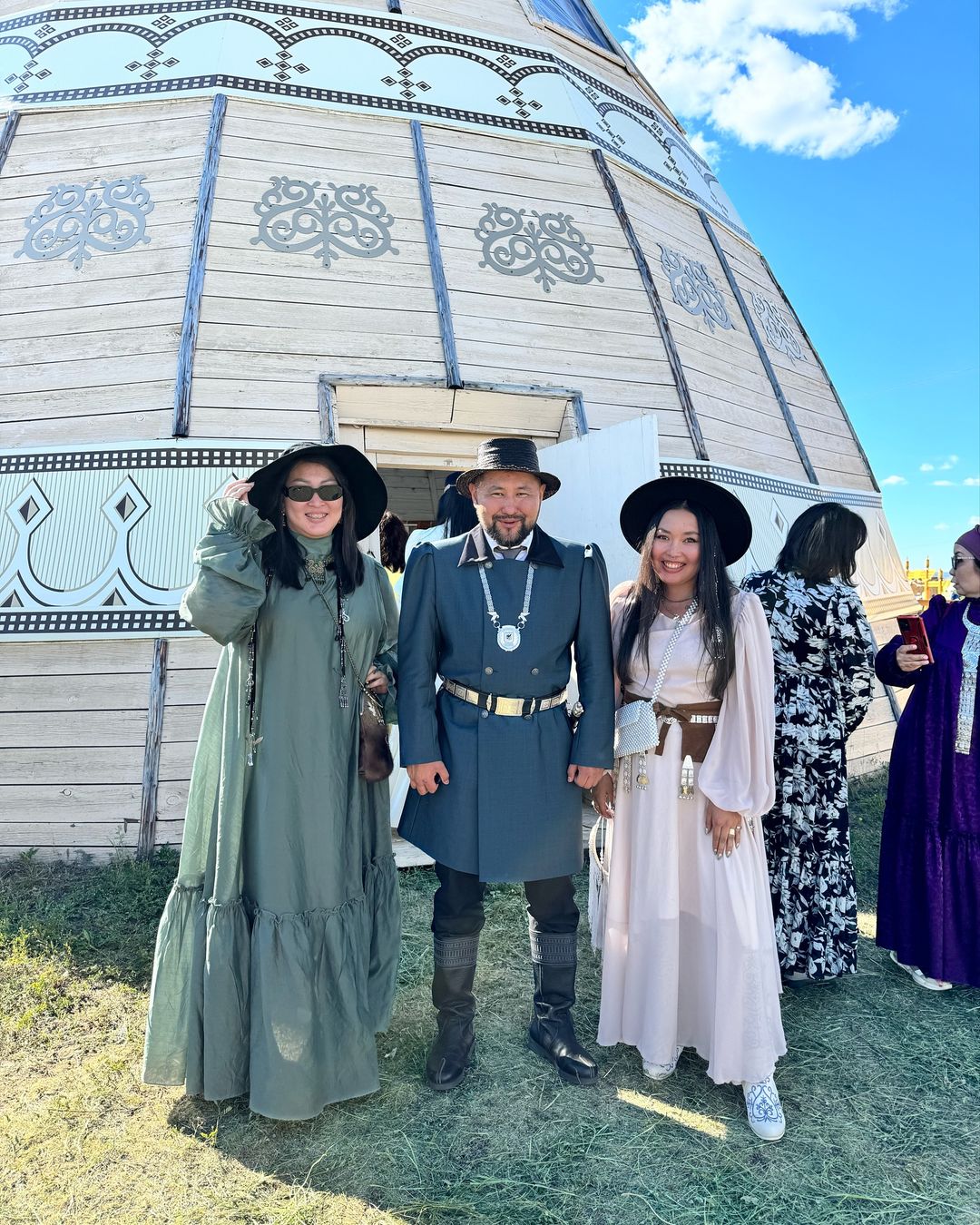 Мэра окружили прекрасные девушки: блогер Елена Аммосова в просторном халадае из легкой ткани и любимица якутян художница Кыдана Игнатьева в светлом стилизованном платье.