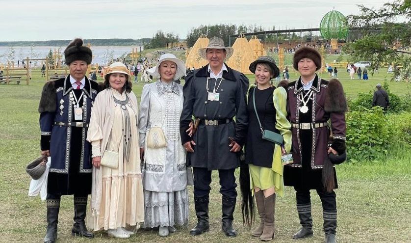 На данном фото всю палитру и разнообразие якутских современных костюмов демонстрируют семьи глав улусов: глава Таттинского улуса Михаил Соров, глава Амгинского улуса Николай Архипов и глава Горного улуса Никита Андреев с женами. Фото из тгк https://t.me/pranyamedia.
