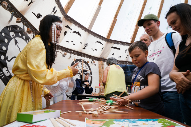 В якутском шатре ту же функцию выполняют настоящие оленьи шкуры, вызывающие неподдельный интерес у гостей. А еще здесь можно попробовать свои силы в традиционных настольных (или напольных?) играх. Руководитель Молодежного центра РГО в Республике Саха — Якутия Ньургуйаана Алексеева демонстрирует две из них. Первая — хаамыска. Так называются маленькие деревянные кубики. Смысл игры: поочередно подбрасывая один кубик, нужно собирать той же рукой те, что лежат на столе, и при этом изловчиться и поймать первый.