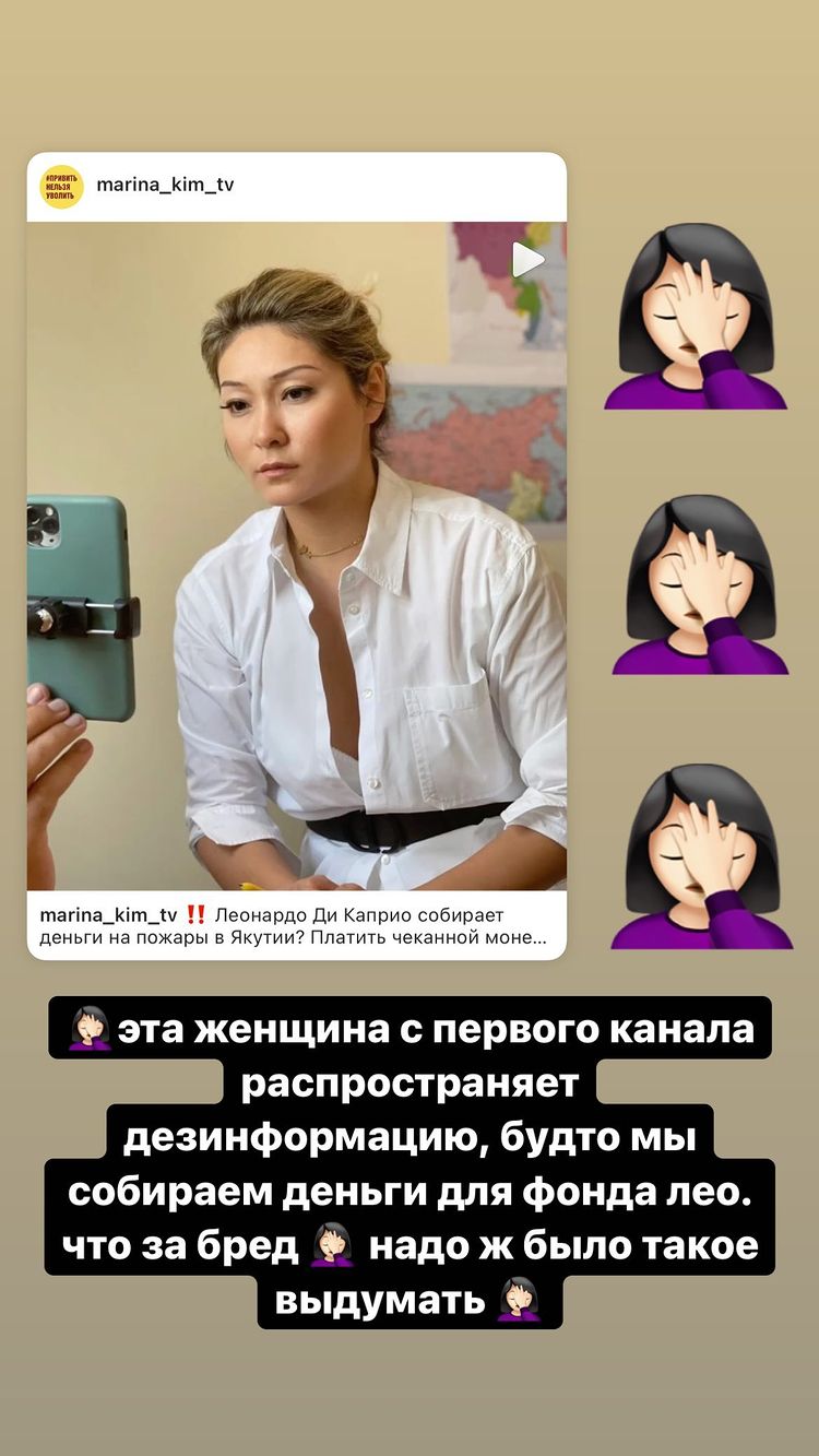 "Марина Ким @marina_kim_tv распространяет дезинформацию о сборе денег для фонда Ди Каприо", - возмущаются активисты из Якутии. - Она пишет, будто бы мы собираем деньги для фонда Леонардо Ди Каприо".