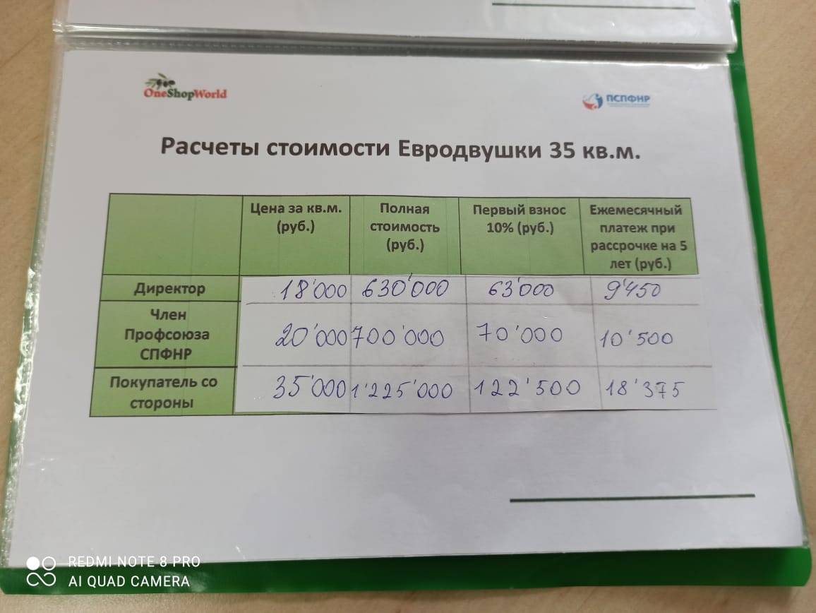 В соцсетях рассылают информацию о том, что некая компания One Shop World предлагает «евродвушку» площадью 35 кв.м. за 700 тыс. руб. Для этого необходимо вступить в Профсоюз свободных предпринимателей, фрилансеров и надомных работников, заплатив 500 рублей, а затем вносить 300 руб. ежемесячно. Презентация проводится в офисе профсоюза каждый день несколько раз. Ее посещают пенсионеры, которые верят, что можно купить квартиру за цену меньше миллиона рублей без ипотечного кредитования и в рассрочку на пять лет.