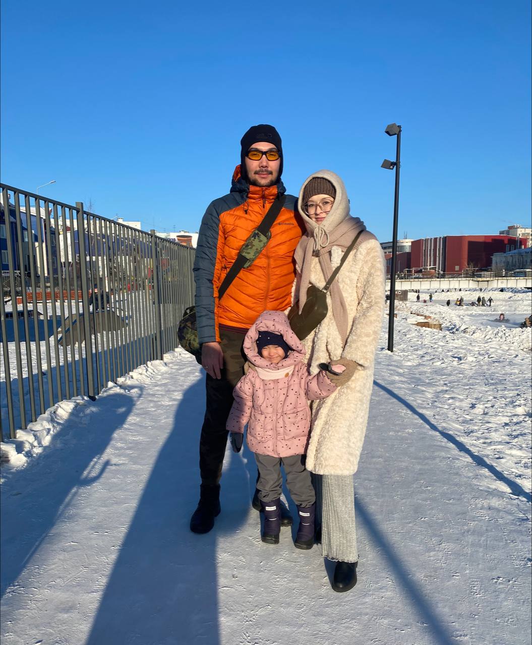 Перед нами счастливая молодая семья. Очень нежные мама и маленькая дочурка одеты розовую палитру. И с ними спортивный и энергичный папа в лыжных очках.