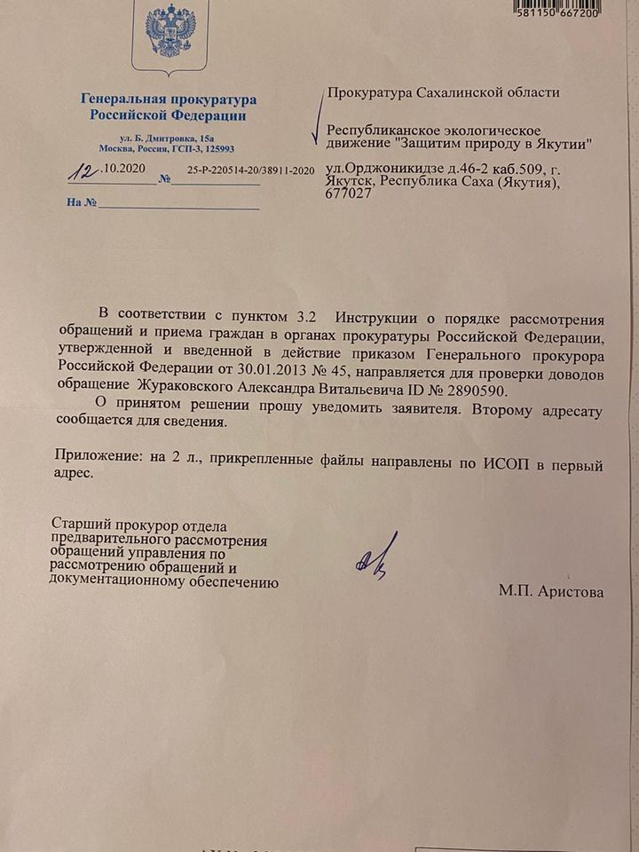 Обращение якутских общественников по поводу уничтожения леса в Якутии, Иркутской области и в Красноярском крае, направленное в Генпрокуратуру, было перенаправлено в прокуратуру Сахалинской области, а не в прокуратуру Якутии.