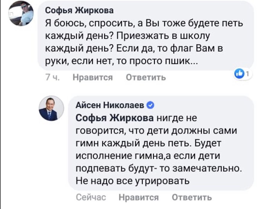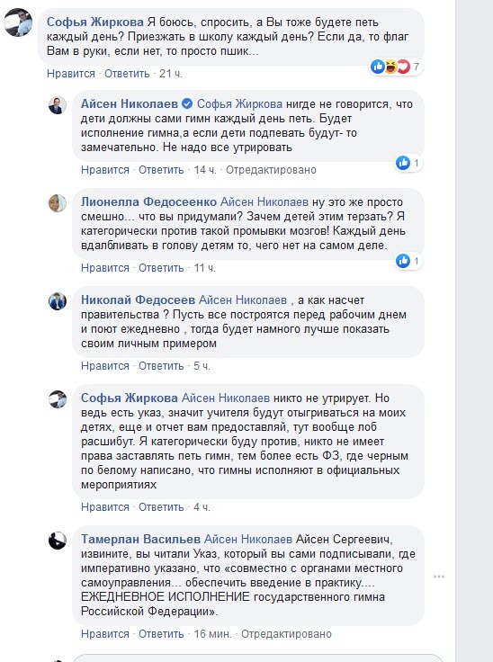 Айсен Николаев на своей странице в Facebook отметил, что нововведение в республиканские школы не обязывает учеников ежедневно петь гимн Российской Федерации.