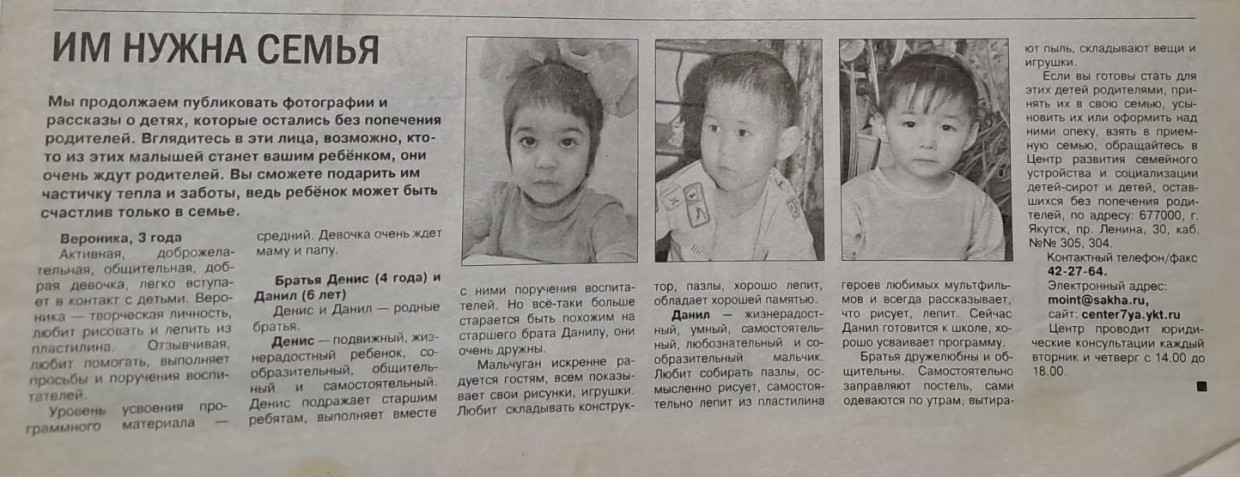 — В газете «Якутск Вечерний» была рубрика «Им нужна семья». Статья как-то сильно запала мне в сердце, и после недолгого обсуждения с мужем мы поехали в Оймяконский детский дом и забрали их с собой, — вспоминает она. — Также на семейном совете решили переехать ко мне на родину в Анабарский район в Саскылах, мне предложили работу и служебное жилье. Устроилась в гимназию, обосновались, а через какое-то время нам позвонили уже с Якутска — биологическая мать наших сыновей за это время успела родить еще троих детей, и ее опять лишают прав.