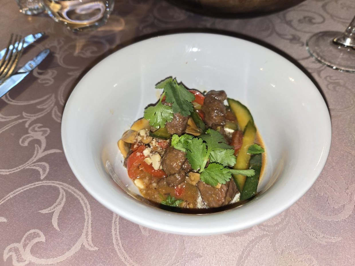 Настала очередь салатов. Поясню, что на гастроужине прошла дегустация. В обычные дни порции будут больше. Теплый салат с олениной – это эксперимент с азиатскими соусами, которые оказывается отлично сочетаются с нашей олениной. Этот салат со сладко-соевым соусом напомнил мне мой любимый – китайский теплый. В следующий раз попрошу ради любопытства сделать мне поострее.