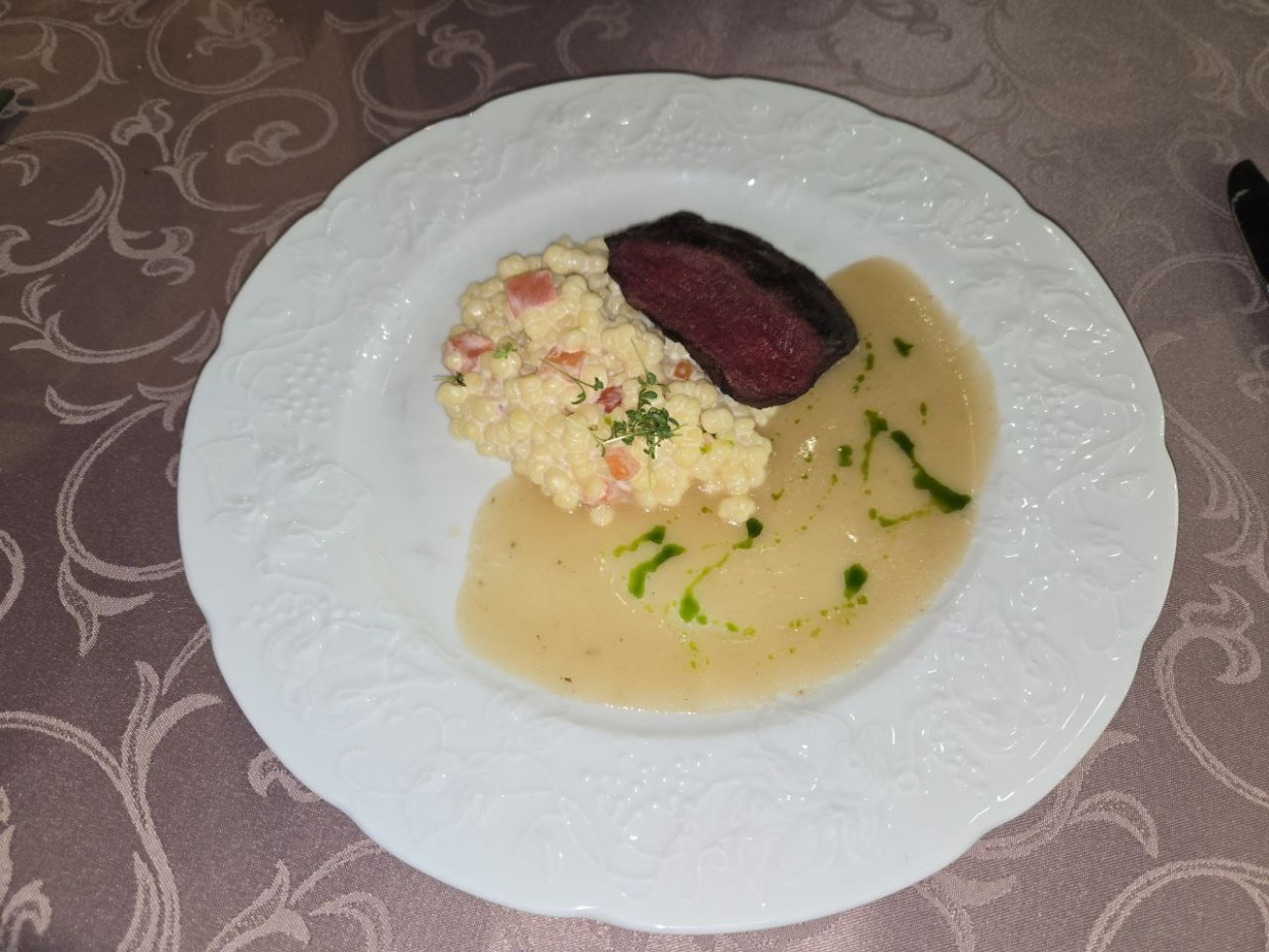 Вкус оленины наиболее раскрывается в средней прожарке на гриле. Это горячее по достоинству оценят ценители благородного красного сухого напитка. Птитим в качестве гарнира был приготовлен до полной готовности, но при этом не был разварен. Это макаронное изделие придумали в Израиле в 1953 году, как замену кускусу и рису, которые не могли себе позволить простые люди.