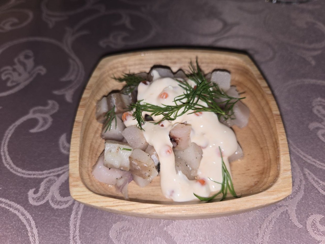 Индигирка была подана с фирменной заправкой, которая сделала этот суровый, холодный салат более нежным и чувственным. А еще заправка делает салат более зимним и праздничным как альтернатива оливье. Кстати, оливье тоже было на столе вместе с овощной нарезкой «Саюри» как велком-блюдо.
