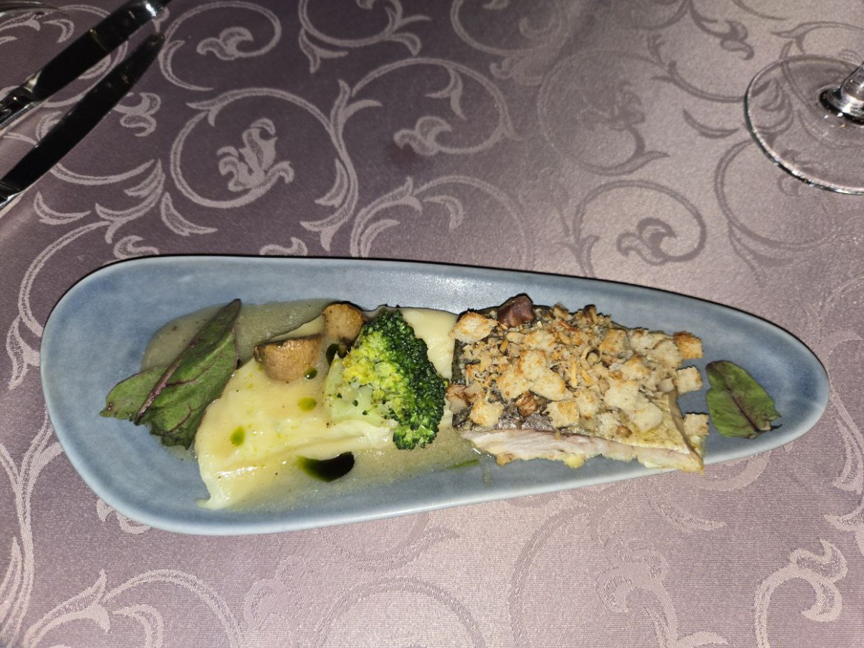 Два вида горячего согрели сердца гостей. И снова чир! На этот раз запеченный в пряной хрустящей панировке. Рыбка таяла во рту вместе с нежнейшим картофельным пюре… Навевая под хруст сухариков… мысли о том, насколько может быть прекрасно жить не земле!