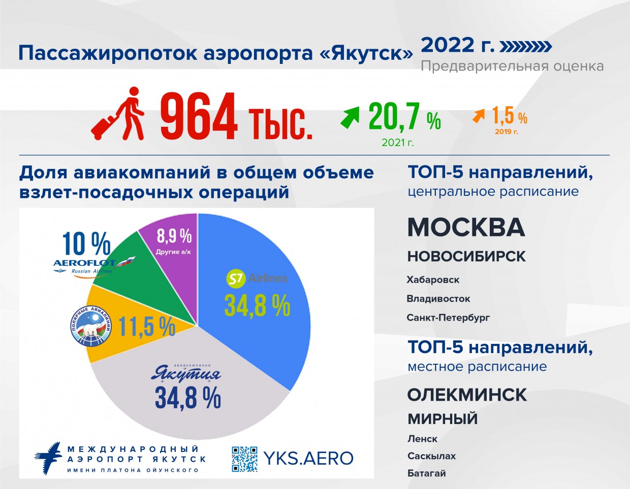 Аэропорт “Якутск” подводит предварительные итоги года. Предприятие завершает год с положительными итогами по всем основным производственным показателям аэропортовой деятельности. Так, в 2022 г. аэропорт обслужил рекордное количество пассажиров, которое до конца года составит более 964 тысяч человек, что на 20, 7 % больше, чем в прошлом году (796 тыс. чел.), и на 1,5 % больше, чем в 2019 г. (949 тыс. чел).