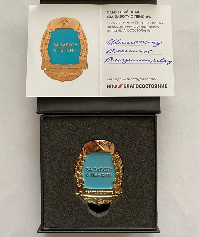 17 сентября директор Дальневосточного филиала НПФ «Благосостояние» Олег Гашута в рамках рабочего визита в г. Алдан вручил генеральному директору Акционерной компании «Железные дороги Якутии» Василию Шимохину Памятный знак «За заботу о пенсии» Негосударственного пенсионного фонда «Благосостояние» за вклад в работу по развитию системы негосударственного обеспечения пенсионеров. Вручение Памятного знака состоялось в честь 25-летнего юбилея НПФ «Благосостояние» и 15-летия корпоративной пенсионной программы Акционерной компании «Железные дороги Якутии».