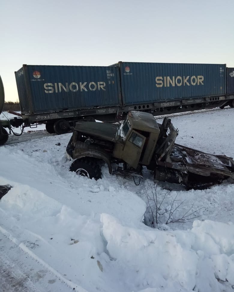 Сегодня ночью в 3 часа 15 минут на 419 км ПК 4 перегона Болотная - Амга произошло столкновение грузового поезда с заглохшим автомобилем-лесовозом без опознавательных знаков на неохраняемом железнодорожном переезде.
